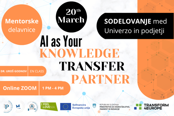 Vabimo vas na interaktivno delavnico AI as Your Knowledge Transfer Partner, namenjeno raziskovalcem, predavateljem, strokovnim sodelavcem in vsem, ki želijo umetno inteligenco uporabljati kot učinkovitega partnerja pri prenosu znanja.